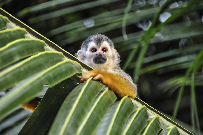 A small squirrel monkey with a white face and orange fur clings to a vibrant green palm frond, illustrating the daily presence of wildlife in Costa Rica.